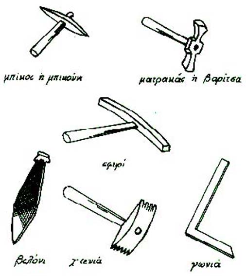 Ντουφέκι, πιστόλι, χαντζάρι, μαχαίρι, λάζο με θηκάρι, σουγιά, κουρέλα (μικρό μαχαίρι), ραβδί, γίλα , γκλίτσα, βέργες , βίτσες, διάφορα σκόπια (ραβδιά), κλαδευτήρια για να κόβει ξύλα, κουροψάλιδα, πυρόβολο ή πρυόβολο ή τσακμάκι για να ανάβει φωτιά, ακόνια για τα χαντζάρια και τα μαχαίρια, ίκλες, τρίχες, γκέμια, καμιτσίκια, κιουστέκια, μαχμούζια ή ζιγκιά, μαγκούρες, πέταλα, σάγματα ή πανωσάμαρα, βουτσέλια, τσετούλα για να μετράει τις καρδάρες με το γάλα, σουφλιά για να ψήνει τα αρνιά, πυρουστιές, διάφορα τσόλια, στρουγκότσουλα (τσόλια της στρούγκας), στραγγιά για να στραγκάει το τυρί ή το γιαούρτι, στραγγοτσαντίλες ή τσαντίλες, κάπες, σακκιά, χαράρια, τρουβάδες, δισάκια , τραγομάλινα τσόλια για να κοιμάται, ξυλοχούλιαρο, χουλιάρι, χουλιάρες, βουτσέλι ή βουτσέλα, βαρέλι ή βαρέλα για να κουβαλούν οι γυναίκες το νερό στην στάνη κλπ.